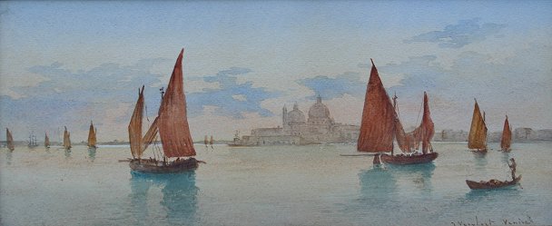 19TH C VENETIAN PAINTING SIGNED VERVLOET: W/C, 5 1/4'' x 13'', signed LR, gesso frame with wear and missing corner, 12'' x 19''.