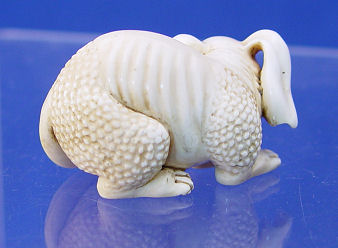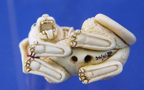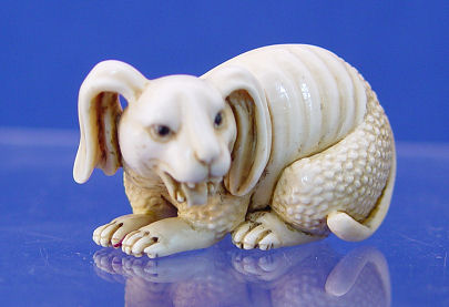 JAPANESE CARVED IVORY NETSUKE: Artist signed grotesque rabbit, 2''l.