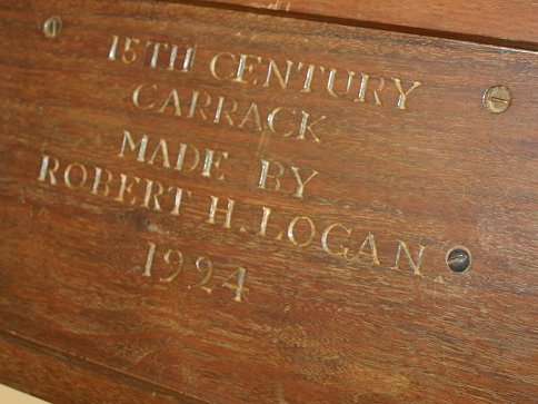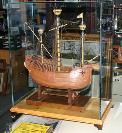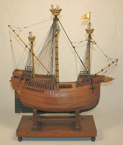 LOGAN, Robert H., (American, 1875-1942): 15th Carrack, wooden ship model, 23''h. x 23''l., incised information on bottom of ship, dated 1924, custom wooden stand, wooden pedestal, encased in protective glass. Sold with the boat will be the original plans drawn up by Logan himself, Logan was a respected American painter, garnering international respect as well; he turned his attention to metal and wood working. This piece was exhibited at the 1997 Suncoast Ship Society's Annual Exhibition, and restored locally prior by Bob Welch. From the artist's estate.