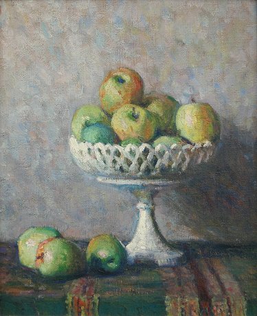 LOGAN, Robert H., (American, 1875-1942): Still Life of Apples, O/C, 18'' x 15'', Macklin Style frame with overpaint and wear, 24'' x 21'', estate stamp verso.