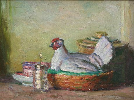 LOGAN, Robert H. (American, 1875-1942): Still Life with Chicken, O/B, 10 1/2'' x 14'', gold frame, 13'' x 16 1/2'', estate stamp verso.