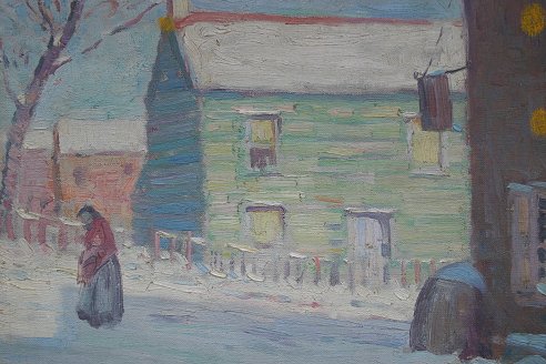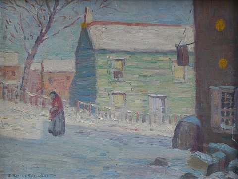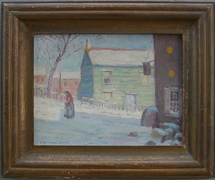 SCHRADER, Roscoe, (American, 1878-1960): Town Scene in Winter, O/C, 12'' x 16'', signed LL, worn period frame, 18'' x 24''.