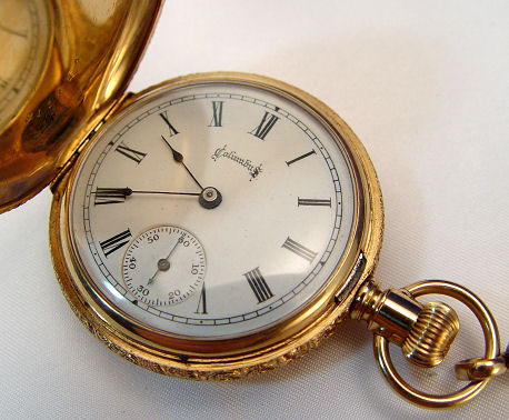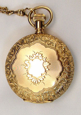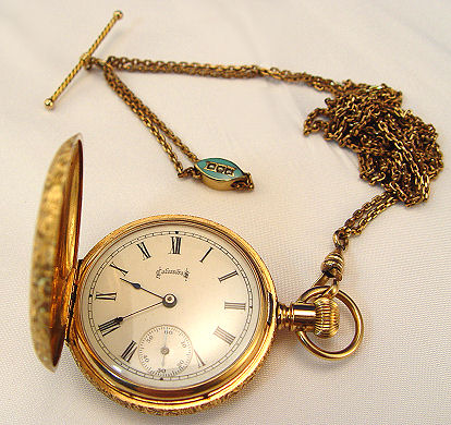 COLUMBUS WATCH CO. 14K POCKET WATCH: 6 size, 3/4 plate, yellow gold hunt case with etched floral design to covers and edges, works marked Columbus Watch Co, serial #283464 dating it to approx. 1896/1897, case marked B.W.C.Co, Warranted 14K U.S.Assay, 813454. Currently on a 24'' yellow gold? box link watch chain with enameled slide and T hook.