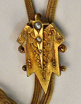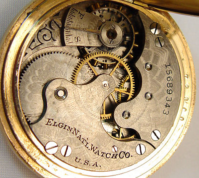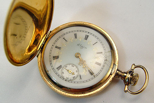 LADY'S ELGIN POCKET WATCH AND VICTORIAN CHAIN WITH SLIDE: Model 1, 6 size, three quarter plate, 15 jewel, gold gears, serial #15689343, dating to approx. 1910. In a gold filled hunt case decorated with birds and scrolls, serial #7972300, Keystone Watch Co, Guaranteed 25 Years J Boss. Currently keeping time despite cracked dial. On a lovely Victorian mesh chain with slide set with seed pearls and decorated with applied bead and wire work. Inside latch marked 14, approx. 17''l., just in case the chain is 23 grams.