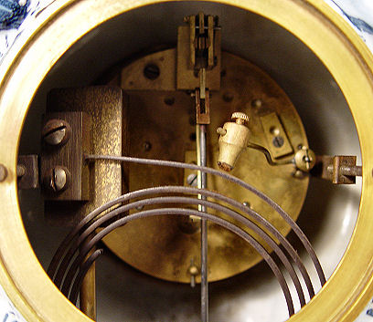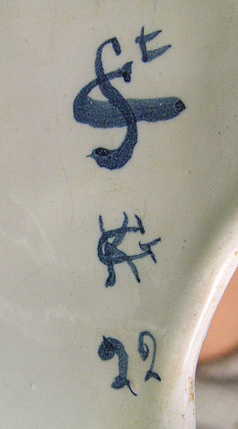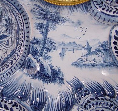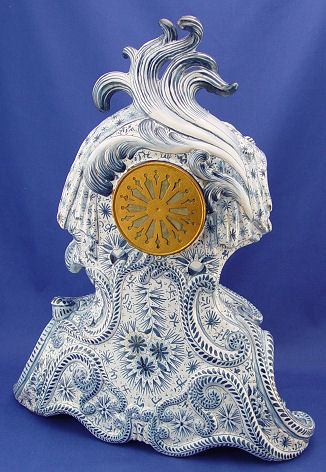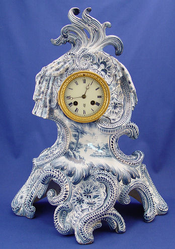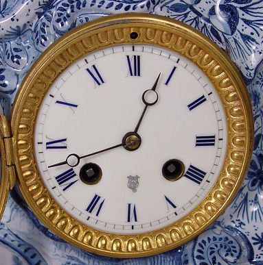 JAPY FRERES FRENCH FAIENCE SHELF CLOCK: Hand painted blue faience case houses a key wind, gong strike clock. The brass works are marked, The enamel dial bears a shield mark with an escapement under the letters BD. The ceramic case is marked as in photo. 20 1/2''h. overall, the dial is 4'' dia. 15'' w. at the base.
