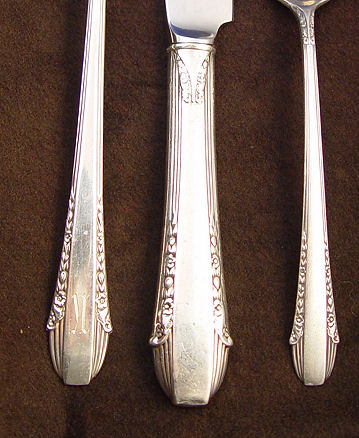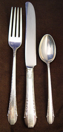 INTERNATIONAL STERLING ''ENCHANTRESS'', SERVICE FOR 12: 96 pieces to include, 12 dinner knives 9 1/2'', 12 lunch knives 9 1/8'', 12 dinner forks 7 7/8'', 11 luncheon forks 7 1/4'', 12 salad fork 6 3/8'', 12 soup spoons 6 1/2'' (four with arched handles), 18 teaspoons 6'' (6 no monogram), 11 butter knives 5 5/8'', 6 cocktail forks 5 1/2'' (no monogram), cold meat fork 8 7/8'', ladle 6 1/8''. All monogrammed with K unless noted above. In a soft top storage case with zip closure.