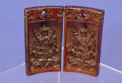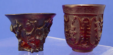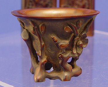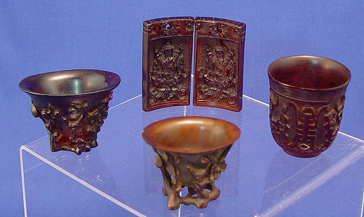 5 CHINESE EXPORT CARVED RHINO HORN CUPS AND PLAQUES: The cups have carved exterior, 1 1/2''-2''h. (The smallest with a chip). The two plaques are drilled with a hole, 2 1/2'' x 1 1/4''.