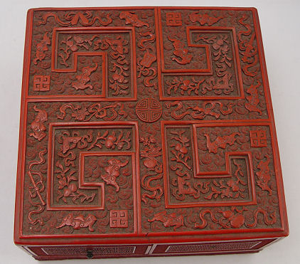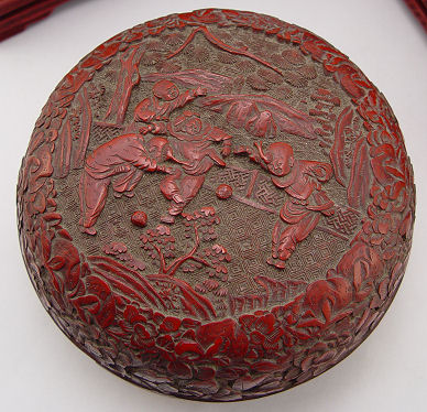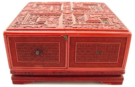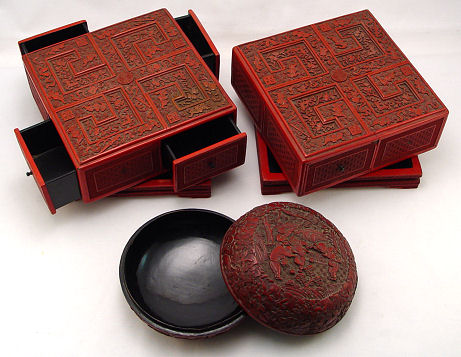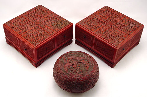 GROUP OF 3 CINNABAR BOXES: 1) Round shaped box, 6 1/2'' dia. 3 1/2''h. with 1/2'' loss of cinnabar on the edge. 2 and 3) A pair of boxes on stands. Each with four drawers, 8 1/4'' square, 4 1/2''h. Please note chip on one corner of one drawer.