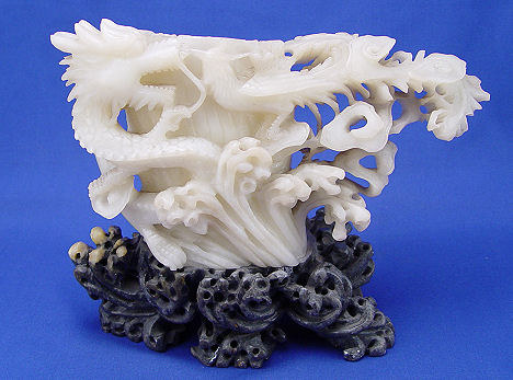 CHINESE CARVED SOAPSTONE DRAGON FIGURAL VASE: Elaborate rendition of a dragon, 8''h., 4 1/2''w.