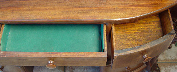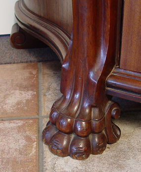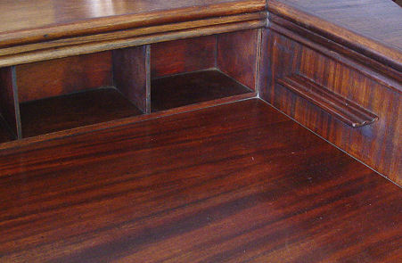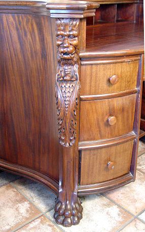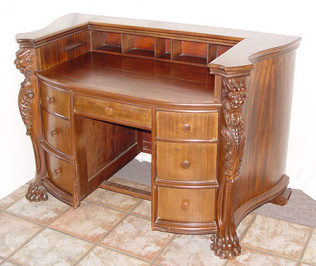 MAHOGANY LION CARVED DESK attrib. to HORNER: Unusual shape with serpentine sides, bowed front, drop center and lion carved stiles. Built in pen holders and pigeon holes. 36''h x 54'' x 28 1/2''