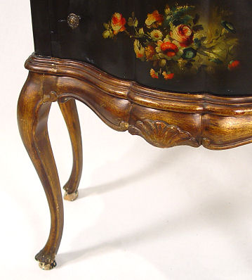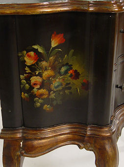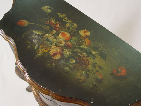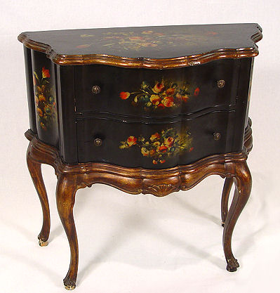 FRENCH PAINT DECORATED PETITE COMMODE: Serpentine front and sides, 2 drawers stand. 30 1/2''h. x 30'' x 13''. Please note some paint loss at the feet.