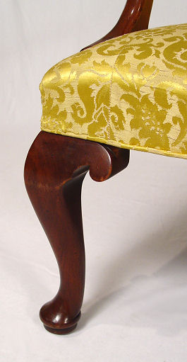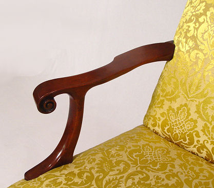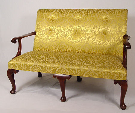 WILLIAMSBURG SOFA BY KITTINGER: Mahogany cabriole legs and scrolled hand holds. Tufted 37'' high straight back. 6 legs with one being branded Williamsburg Restoration Kittinger Buffalo. 53''l., 24'' deep.