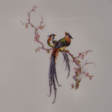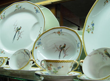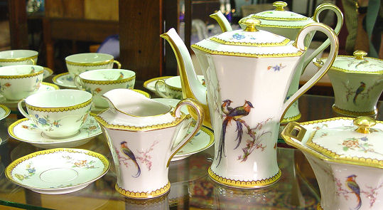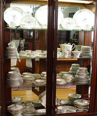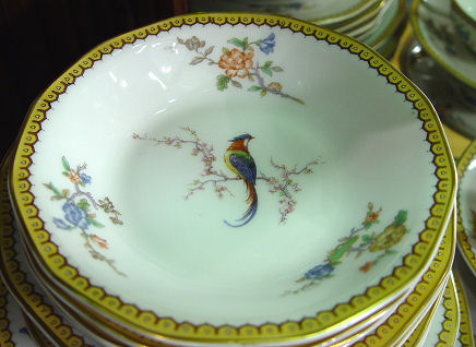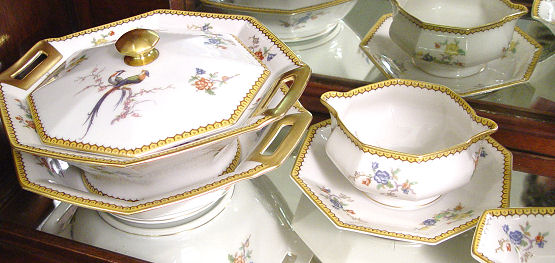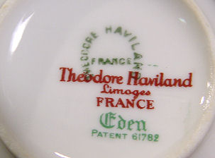 THEODORE HAVILAND FRENCH LIMOGE ''EDEN'' FINE CHINA SERVICE: Large 130 piece service to include 8 dinner plates (9 5/8''), 8 luncheon plates, 9 salad plates, 9 bread plates, 8 dessert bowls, 8 cereal bowls, 8 low soup bowls, cream soups with under plates, 8 bouillons with saucers, 8 cups & 15 saucers, covered sugar & creamer, coffee pot with lid, gravy with underplate, 2 covered vegetable bowls, 3 open vegetable bowls, 2 oval open vegetable bowls, 2 platters with juice wells(largest is 16''), 1 chop plate, 1 cranberry bowl, 1 demitasse saucer, relish dish and celery dish. Set is old and has some very minor chips.