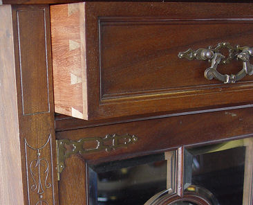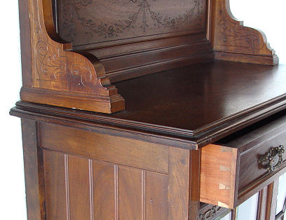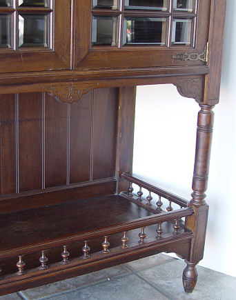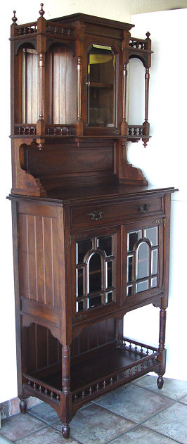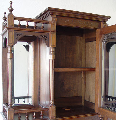 A WALNUT VICTORIAN DIMINUTIVE SIDE CABINET: An unusual narrow width, mirror back open display and glass front storage and display. Gallery top with finials, ornamental hardware. 76''H. X 31''X 15''.