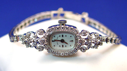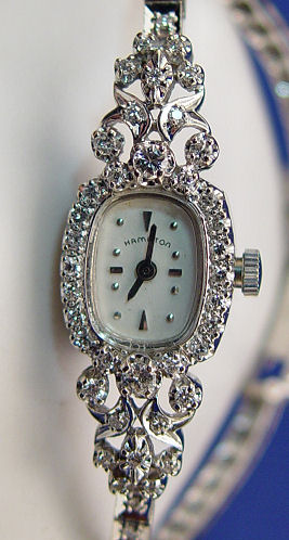 LADY'S HAMILTON DIAMOND DRESS WATCH: Delightful 14k white gold wrist watch and bracelet encrusted with approx. 2ctw of diamonds, watch face measures approx. 3/4'' x 1/2'', 18 grams, approx. 7''l. adjustable clasp with safety latch plus safety chain. Est. $600/800**