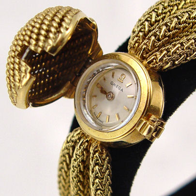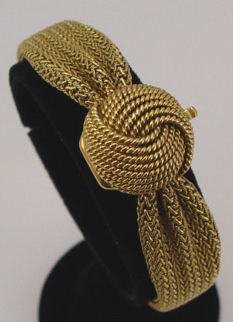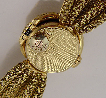 LADY'S OMEGA 18K PEEKaBOO WRIST WATCH: 18k yellow gold case with attached bracelet, in a mesh and love knot motif, 17 jewel works, movement serial #17704353, 7 1/2'', adjustable clasp, 40 grams.