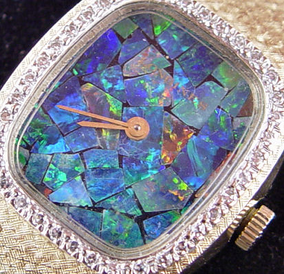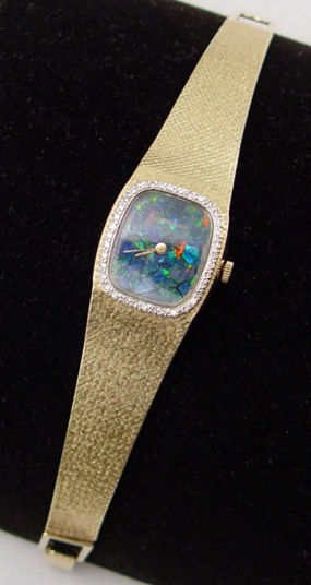 LONGINES LADY'S 14K WRIST WATCH: 14k yellow gold case with attached bracelet, approx. 36 or 37 round brilliant cut diamonds of approx. 1pt each surround the mosaic opal dial, 17 jewel works, model 528, serial #52902683, case marked Longines-Wittnauer 14K Gold R6622 237889, 7'', 46 grams. Manual wind currently keeping time.