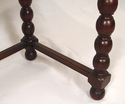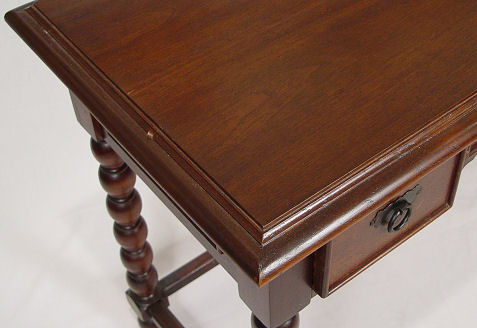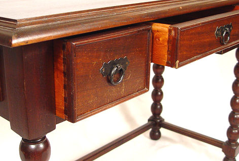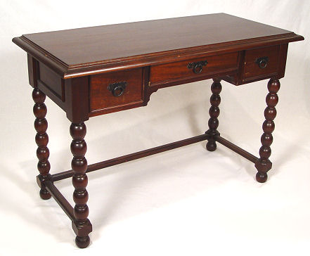 MAHOGANY WRITING TABLE: 3 drawers on dramatic spool turned legs joined by support stretchers. 31''h x 45'' x 22''.