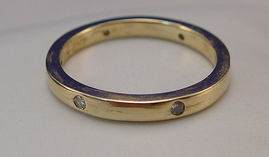DIAMOND ETERNITY BAND: Solid 14k yellow gold band inset with 6 tiny diamonds, approx. 1/4ctw, size 9.5, 3.9 grams. Est. $200/400**
