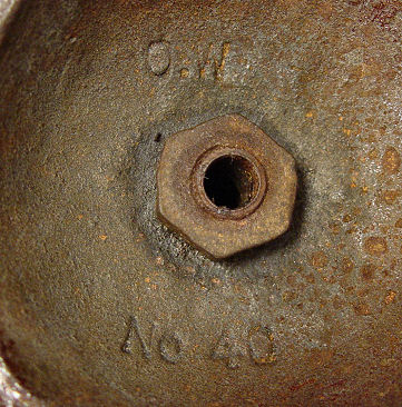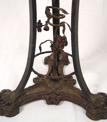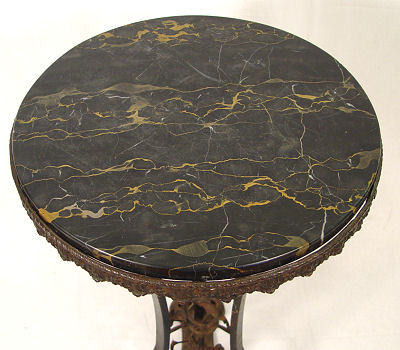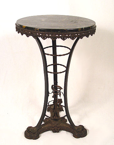 1920'S MARBLE TOP WROUGHT IRON TABLE: Stylish design of cast and wrought iron with claw feet and floral center piece, marked to bottom O.W No 40, black and gold variegated marble top, approx. 18 12''dia, 30''h.