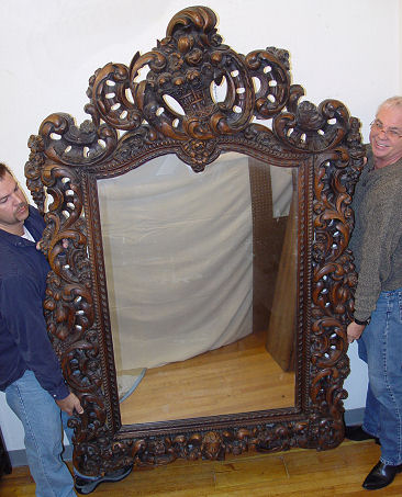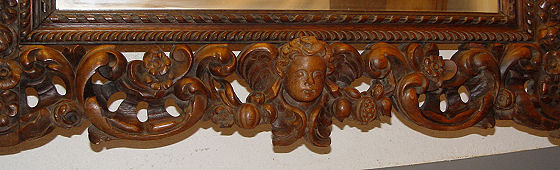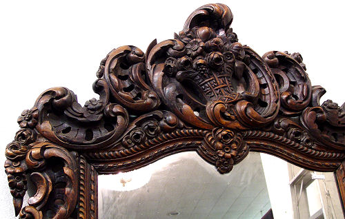 19th C. FRUIT CARVED OAK MIRROR: Superb mirror with crest of cornucopia spilling over with fruit and acanthus leaves. 76'' x 49'' overall. The glass is 47'' x 31''.