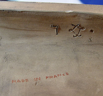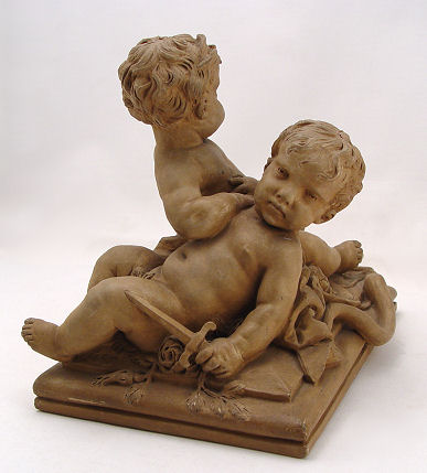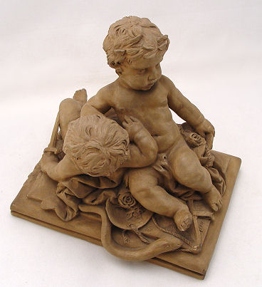 TERRA COTTA STUDY OF PUTTI: Purported to be for a larger Sevres piece, marked inside bottom with impressed Sevres mark and L date mark, also stamped in red Made in France, base is 8 3/4'' x 6 3/4'', approx. 8 1/4''h. Actual age unknown.