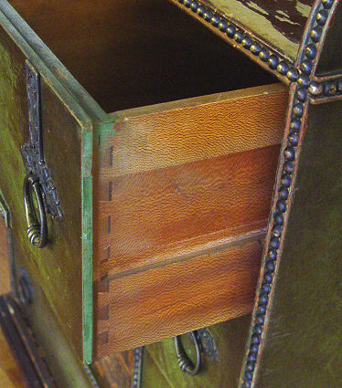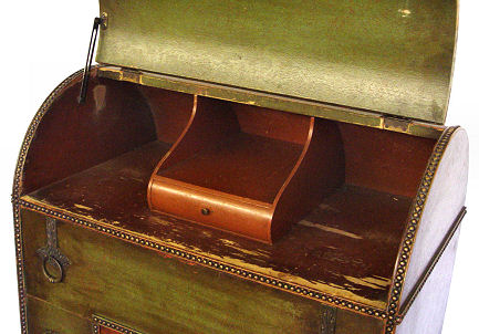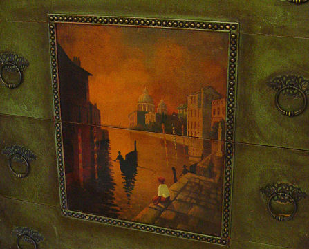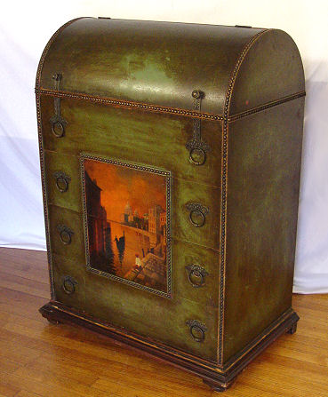 1920's VENETIAN PAINT DECORATED DOME TOP DESK: The green painted finish has a leather effect, the Venetian scene encompasses the drawers. Dome top with interior cubicles and writing surface, in the manner of a slant front desk. Compartmented top drawer. 45''h. x 31''w. x 19 3/4'' deep.