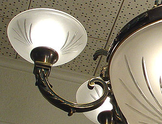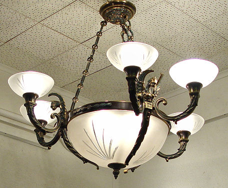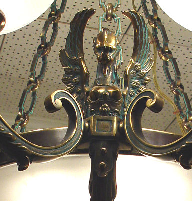 WINGED GRIFFIN BRASS AND ETCHED GLASS CHANDELIER: Six arms with a central dome shade. Verdi green accents on the brass. Hangs approx. 30'', 36'' dia.