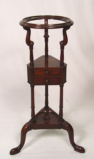 KITTINGER COLONIAL WILLIAMSBURG MAHOGANY BASIN STAND: CW5-Wm. 2 drawer stand, 33''h., 12'' dia. at the top. Paper label on underside, nameplate in drawer.