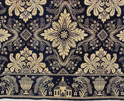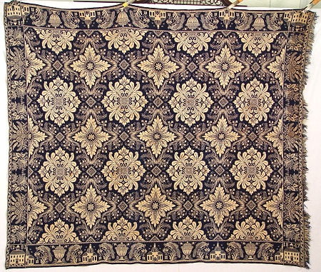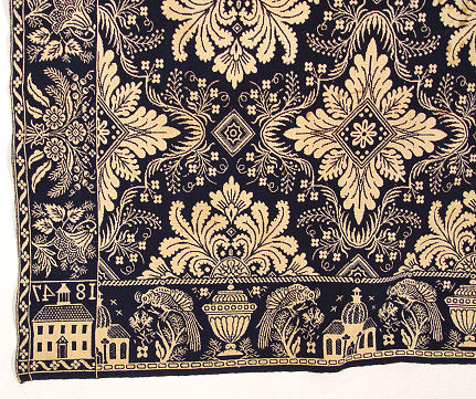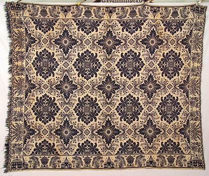 DECATUR COUNTY INDIANA WOVEN COVERLET DATED 1847 BY THE CRAIG FAMILY: Natural-color cotton and indigo blue wool warp, decorative border on all four sides with the trademark Craig family Decatur County Courthouse at the corners. Approx. 83'' x 47'' with fringe on one end.
