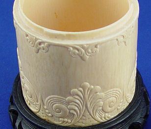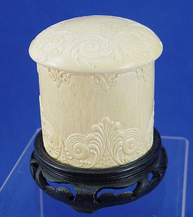 TIFFANY & CO CARVED IVORY BOX: Signed Tiffany & Co. Dome top canister lid with twist lock fit. Carved in an Art Nouveau design, impressed mark ''Tiffany & Co.'', 3 1/2''h. 3 1/2'' dia.