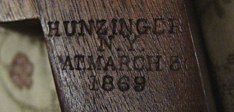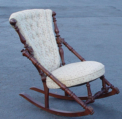 19th C VICTORIAN SIGNED HUNZINGER ROCKING CHAIR: Tufted back, impressed Hunzinger brand. 30''h. x 23''w. overall.