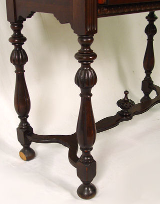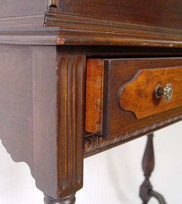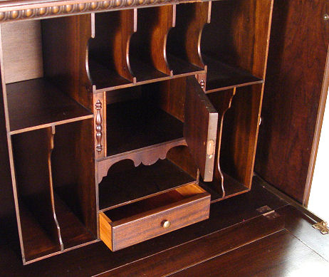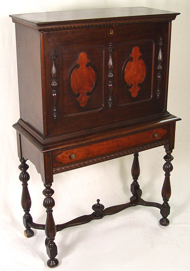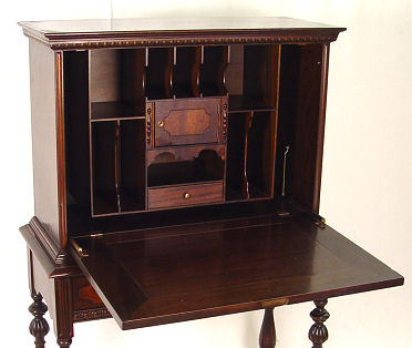 1920'S DROPFRONT DESK: Interior with cubbies, single door and small drawer, over full drawer on open base with shaped legs and cross stretchers, 50 1/2''h. x 33''w. x 15''d.