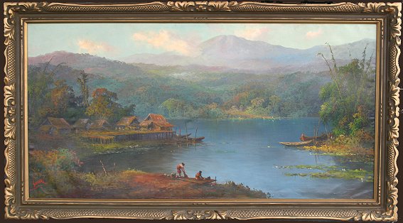 PANORAMIC O/C SIGNED BASAR, LAGOON SCENE WITH VOLCANO: 27'' x 54'', signed LL, carved and gilded frame with wear, 33'' x 60'', titled verso, ''Tongka Bon Prau? Volcano''.