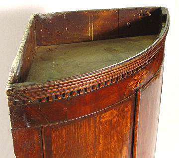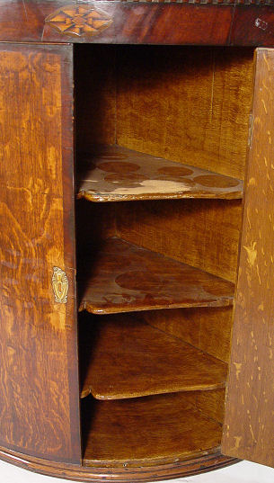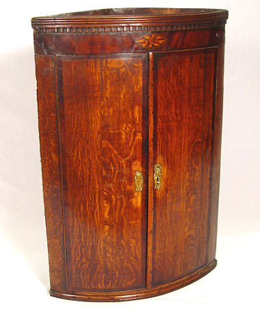 19TH C BOW FRONT WALL MOUNT TIGER OAK CORNER CABINET: Richly grained door panels, inlaid patera under the molded crest. 39''h. x 27''w. x 16''deep. Est. $800/1200**