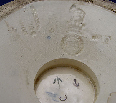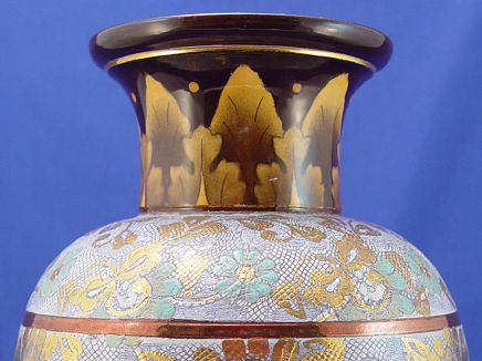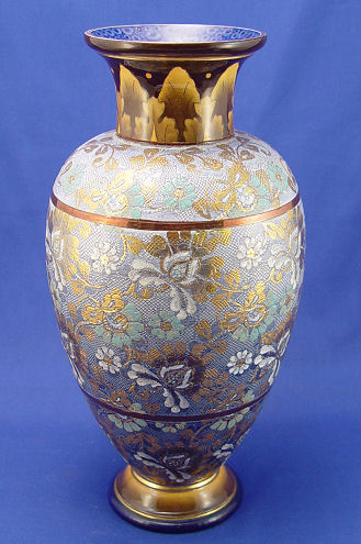 LARGE ROYAL DOULTON SLATERS PATENT EARTHENWARE VASE: 14''H. Note the interior rim floral design and exterior leaf design on the neck. There are copper luster bands on the body of the Slaters effect. Impressed mark, free of chips or crack.