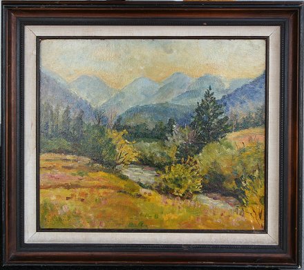 CLIFTON, Flo, (American, 20th C.): Estes Park Landscape, O/B, 20'' x 24'', titled verso in elaborate partially legible script, worn wood frame, 28'' x 32''.