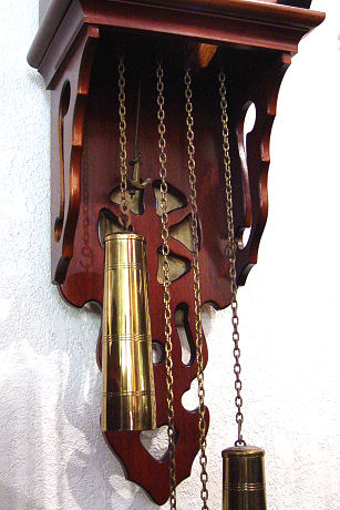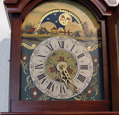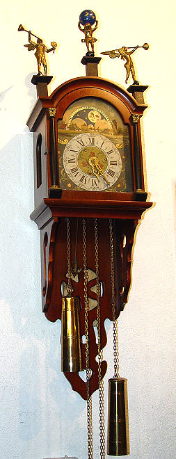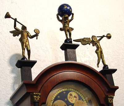 DUTCH MOON PHASE WALL CLOCK: Surmounted by a trio of brass figures, Atlas and 2 angels. Hand painted moon phase, mahogany wall mount clock, weight driven. The figures are 5''h. clock is 26''h., 9 1/2''w.