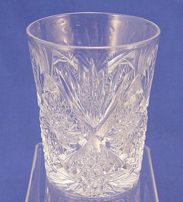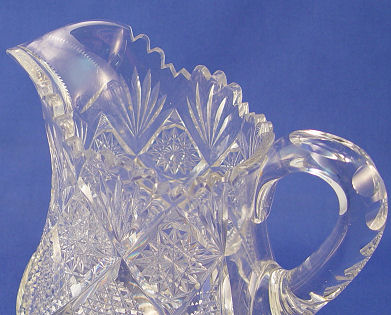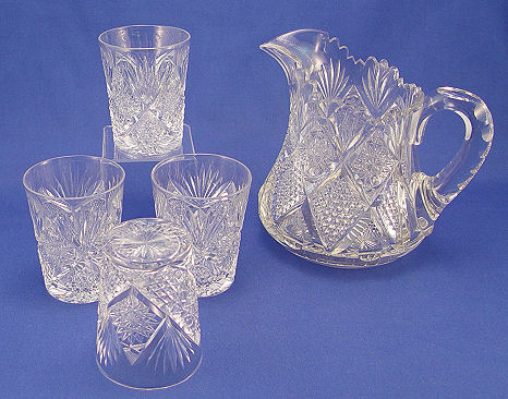 SIGNED LIBBY AMERICAN BRILLIANT CUT GLASS WATER SET: The 6'' pitcher is signed on the handle (very faint chip under the rim). The 4 tumblers are cut in the same pattern as the pitcher, they are 3 1/2''h.