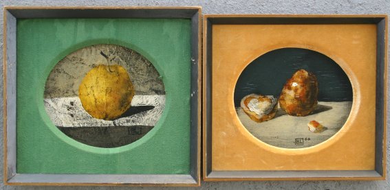 PAIR MODERNE STILL LIFE O/Bs: A Lemon and an unidentified fruit or vegetable, 5 3/4'' x 6 3/4'', and 5'' x 7'' respectively, both monogrammed BL, the second dated '67, partial Galeria Sun label affixed verso.