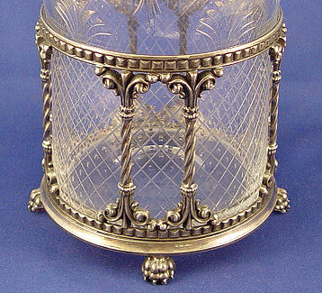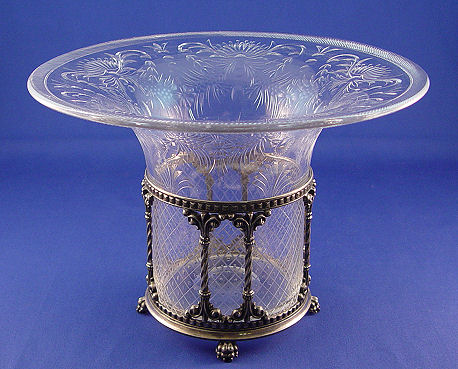 PAIRPOINT SILVERPLATE MOUNTED CUT GLASS VASE: Neo-classical style silverplated signed Pairpoint frame holds the flared rim cut glass vase. The glass is unsigned, free of chips or cracks. 8 1/2''h, 12 1/4'' dia. at rim.