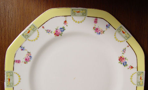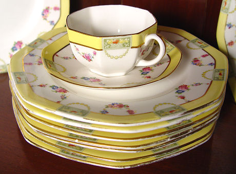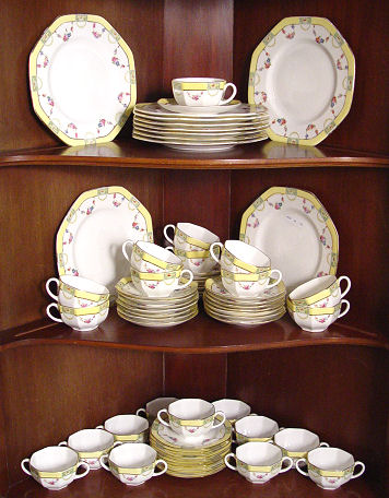 ROYAL DOULTON LUNCHEON SERVICE FOR 12: Yellow and gold with floral wreaths. Includes 12 luncheon plates, 12 bouillon cups, 12 soup plates, 12 cups & 12 saucers.