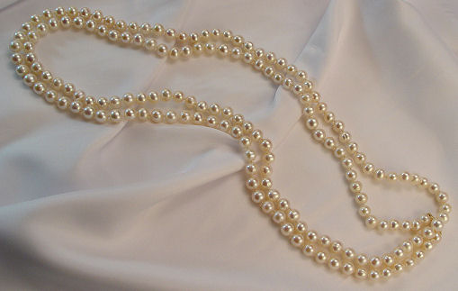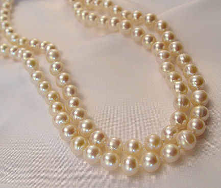53'' STRAND OF CULTURED FRESH WATER PEARLS: Approx. 7.5-8mm pearls, slightly flatten in shape, lovely creamy white color, double knotted, 14k yellow gold clasp.
