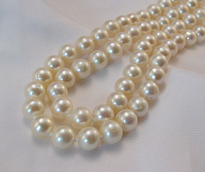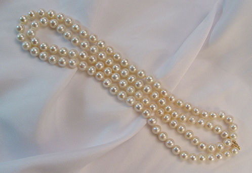 36'' STRAND OF CULTURED FRESH WATER PEARLS: Approx. 8-8.5mm pearls, creamy white color, double knotted, 14k yellow gold clasp.