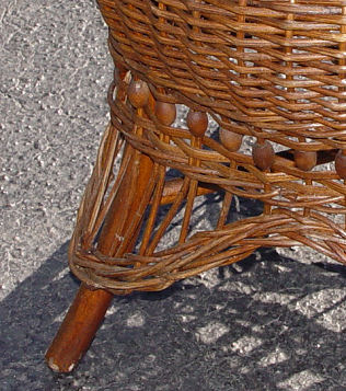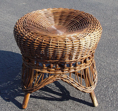 VICTORIAN WICKER HASSOCK, CA 1890: Natural with clear topcoat, ring of wood bead trim above legs, 17 1/2''dia, 15 1/2''h.