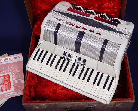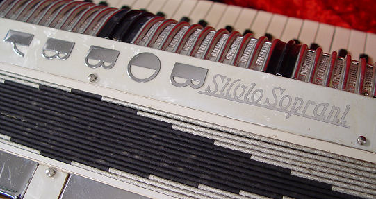 SILVIO SOPRANI ACCORDION: In good working order. Sold with the case. Overall case size is 21'' x 18'' x 9''.
