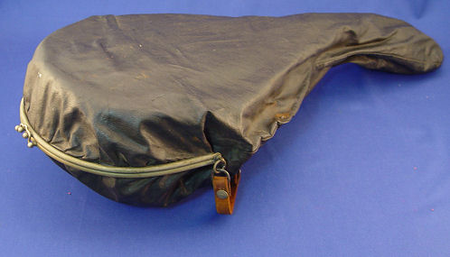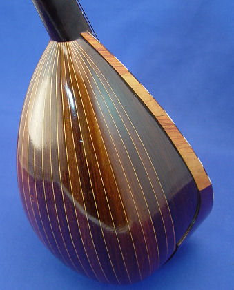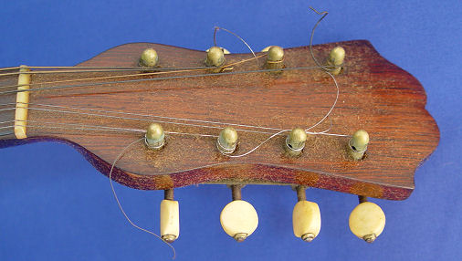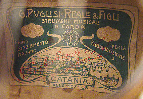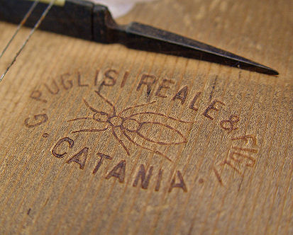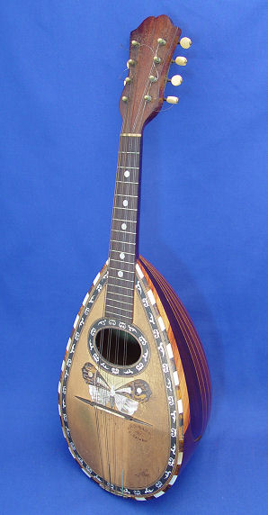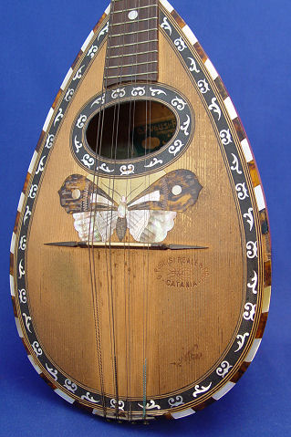 ITALIAN MOTHER OF PEARL INLAY 8 STRING MANDOLIN: Puglisi, Reale, and Figli label and stamped brand. Inlaid butterfly design, ivory keys, striped inlay body. Approx. 23'' long. Sold with the soft carry case.