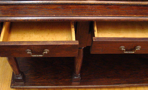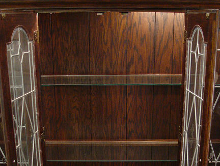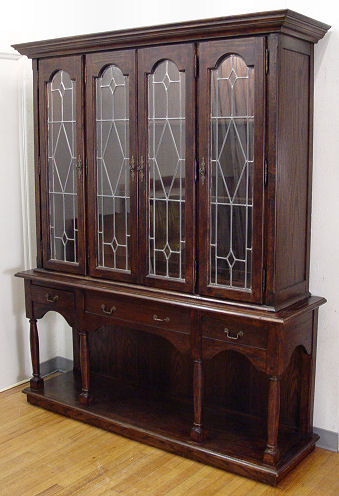 FRENCH COUNTRY OAK CHINA CABINET: Four leaded glass doors over drawers, over open cabinet base. 81''h. x 66'' x 18''. Illuminated interior with glass shelves. Matches the table and chairs sold at previous lot #40.