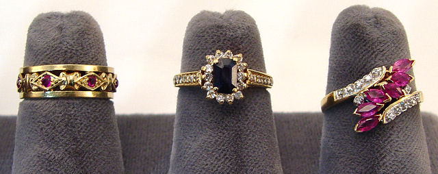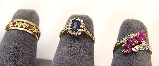 LOT OF THREE LADY'S RINGS: To include, 18k filigree band set with seven tiny rubies, size 4.75, 3.1 grams. Sapphire and diamond Princess Di style, 14k marked Tru Glo, size 4, 2.8 grams. Ruby and diamond bypass ring of 14k yellow gold, size 6.5, 3.1 grams. Sold as a lot.
