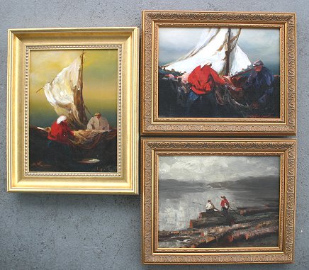3 MYSTERY PAINTINGS, SIGNED N.Y.C., 1966: Italian? dockside scenes (2), and 2 figures fishing, O/C's, all approximately 9'' x 12'' (12'' x 9''), contemporary gold frames, signed illegibly.